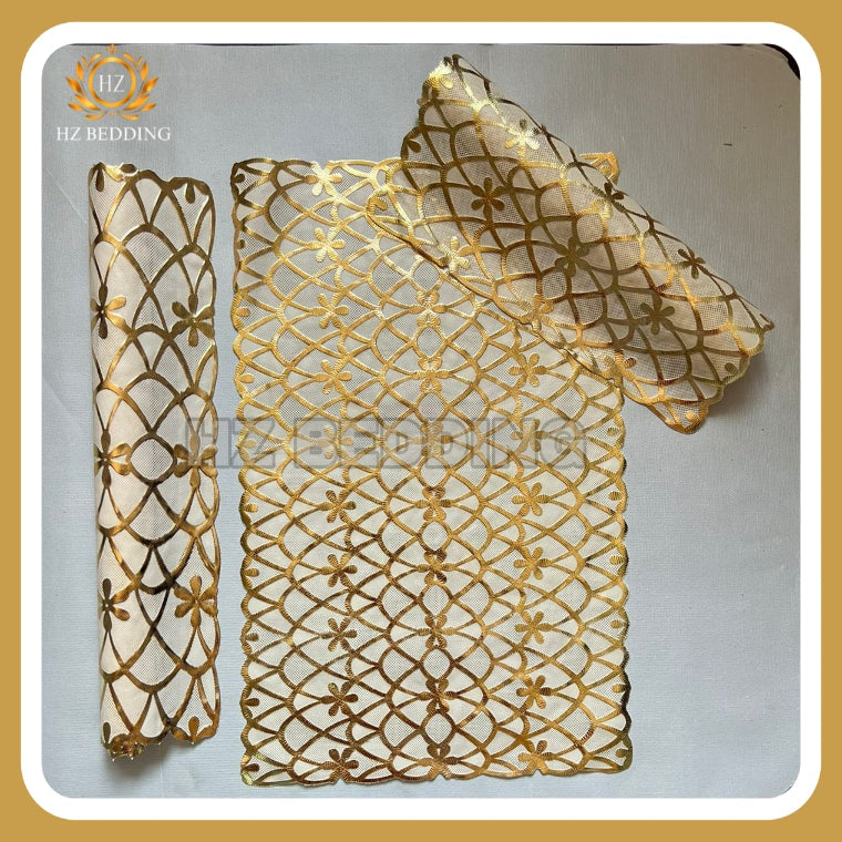 This set of 3 table mats is perfect for adding a touch of elegance to your dining table or dressing table. The large mat measures 15x36 inches, while the two smaller mats measure 12x18 inches each. Made from premium quality vinyl soft plastic, these mats are durable and easy to clean. The golden color adds a touch of sophistication to any room. Use them as placemats or coasters to protect your furniture from spills and stains. These mats are perfect for both formal and casual occasions. Add a touch of luxury to your home with these beautiful table mats.